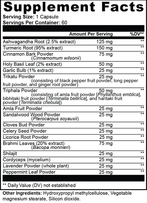 Ingredients: Ashwagandha Root (2.5% extract), Turmeric Root (95% extract), Cinnamon Bark Powder (Cinnamomum wilsonii), Holy Basil Leaf (2% extract), Garlic Bulb (1% extract), Trikatu Powder (consisting of black pepper fruit powder, long pepper fruit powder, and ginger root powder), Triphala Powder (consisting of amla fruit powder [Phyllanthus emblica], bibhitaki fruit powder [Terminalia bellirica], and haritaki fruit powder [Terminalia chebula]), Amla Fruit Powder, Sandalwood Wood Powder (Pterocarpus soyauxii), Cloves Bud Powder, Celery Seed Powder, Licorice Root Powder, Brahmi Leaves (20% extract) (Bacopa monnieri), Shilajit, Cordyceps (mycelium), Lavender Powder (whole plant), Peppermint Leaf Powder, Hydroxypropyl methylcellulose, Vegetable magnesium stearate, Silicon dioxide.