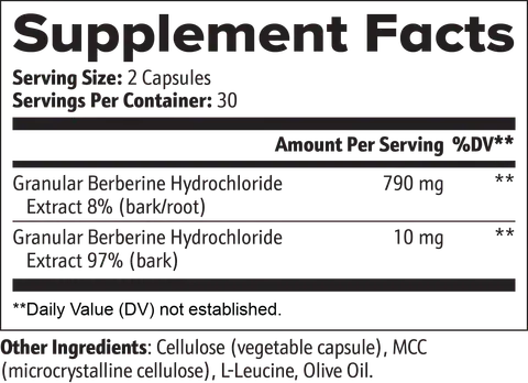 Ingredients: Granular Berberine Hydrochloride Extract 97% (bark), Granular Berberine Hydrochloride Extract 8% (bark/root), Cellulose (vegetable capsule), MCC (microcrystalline cellulose), L-Leucine, Olive Oil.